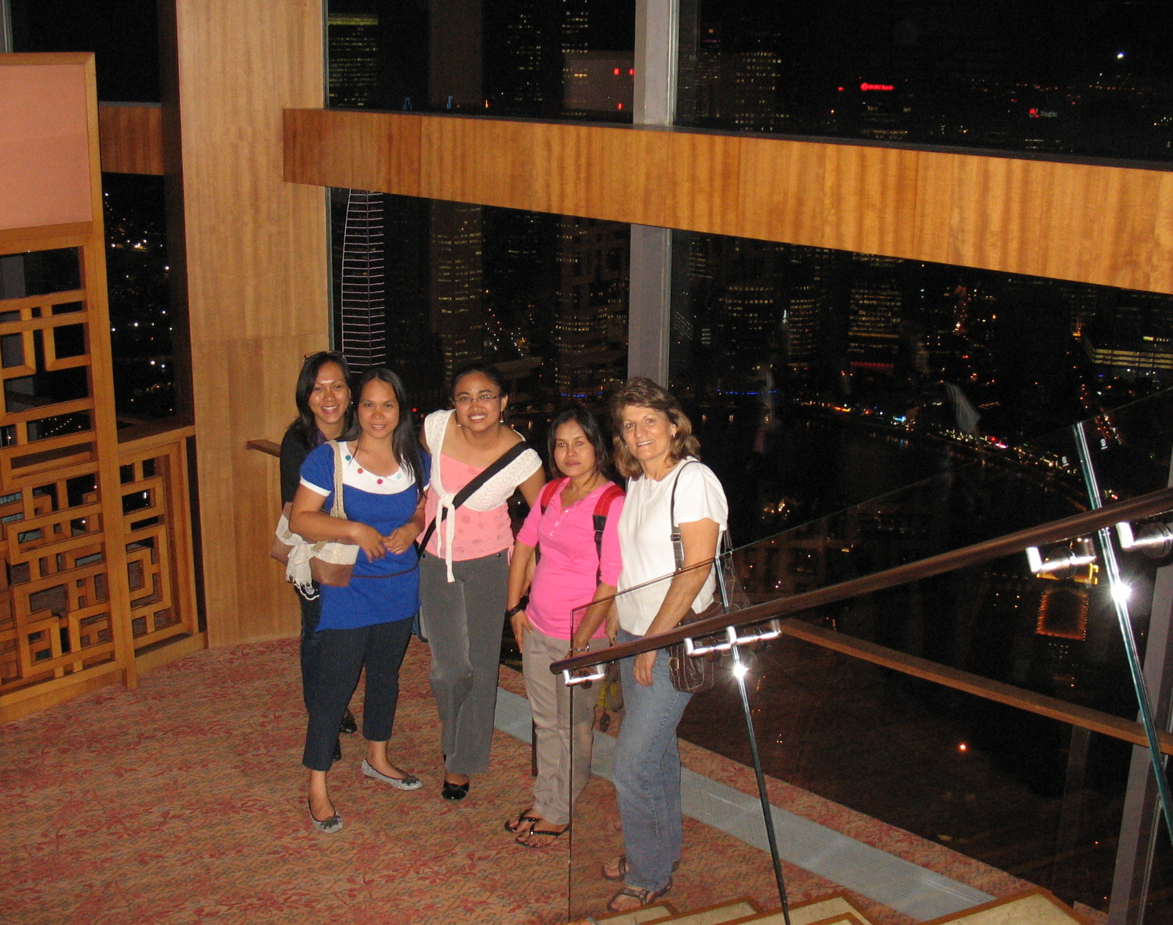 For some of the younger ladies, this was their first trip outside of their own countries and some had never seen a building higher than eight storeys. Wednesday evening, two of us, along with six ladies did a quick tour of some of the sights of downtown Singapore. The highlight for me was taking the girls to the observation area on the 70th floor of the Stamford Hotel. Once they recovered from the terror of the elevator, they were mesmerized by the view of what is truly a beautiful city. We, of course, saw the Merlion, Raffles, the Fullerton and Clarke’s Quay before heading back to crash at about midnight.