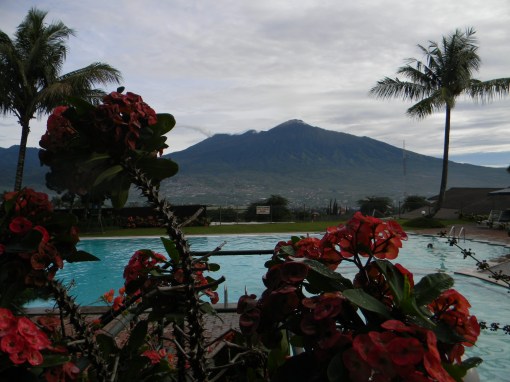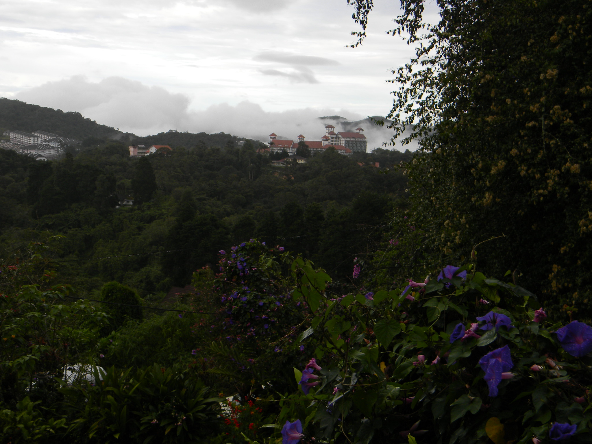 The hotel where we stayed was perched on the side of a mountain overlooking lovely scenery and the temperature was refreshingly cool after the steamy heat of Malaysia. It is the rainy season in this part of the world, so we drove up the mountain in a torrential downpour against a river of water flowing down the road carrying with it all sorts of debris. Due to the rain and fog we were unable to see any scenery the first night but I awoke at five the following morning to bright sunshine and a gorgeous view of the clouds drifting in front of the mountain.