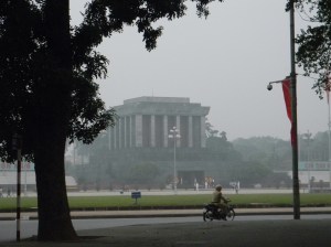 Perhaps that is the fuel behind the cultic devotion to the memory of Ho Chi Minh, the man that led North Vietnam to victory over the Americans in a war that both marked and scarred my generation. We went to see the tomb of old Uncle Ho yesterday and it was one of the weirdest experiences of my life. We were hustled and herded like so many cattle in robotic rows up to this enormous monolithic mausoleum that would have done the ancient pharaohs proud. We had to surrender our cameras and silence our phones and then there we were filing past the embalmed body of Ho Chi Minh lit up with a ghostly light like some Halloween ghoul inside his glass coffin. The slightest deviation from the robotic shuffle – hands in pockets, hands behind the back, hats on – was met with physical correction from the two dozen uniformed and armed guards. Pam’s phone, which she had forgotten to put on silent mode, rang shrilly just as we exited and I confess that we both burst into hysterical and nervous laughter. What if that had gone off in the tomb?