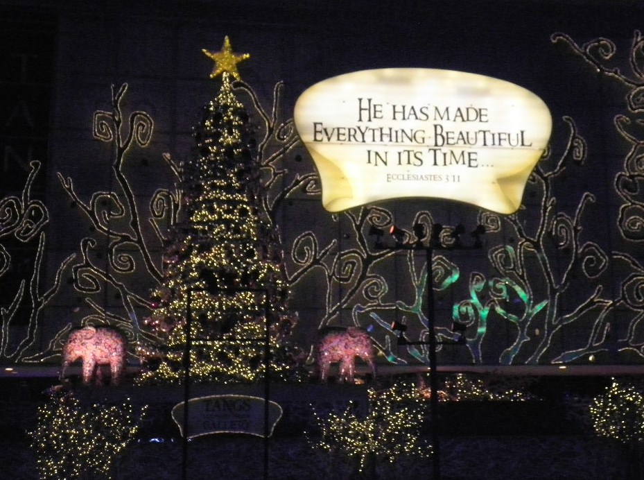 The difference could not be more clearly seen than in Singapore, where we have spent the last two days. Orchard Road – the Fifth Avenue of Asia – was aglow in a blaze of glorious Christmas lights hung from every tree and lamp post. Christmas carolers competed with dancers and mimes in using their own particular art to convey the Christmas message. Nativity scenes lined the sidewalks and spectacular Christmas trees adorned every mall concourse and public plaza. It was a glorious explosion of Christmas cheer, and yes it certainly did cheer our hearts to be part of it; to soak it all in.