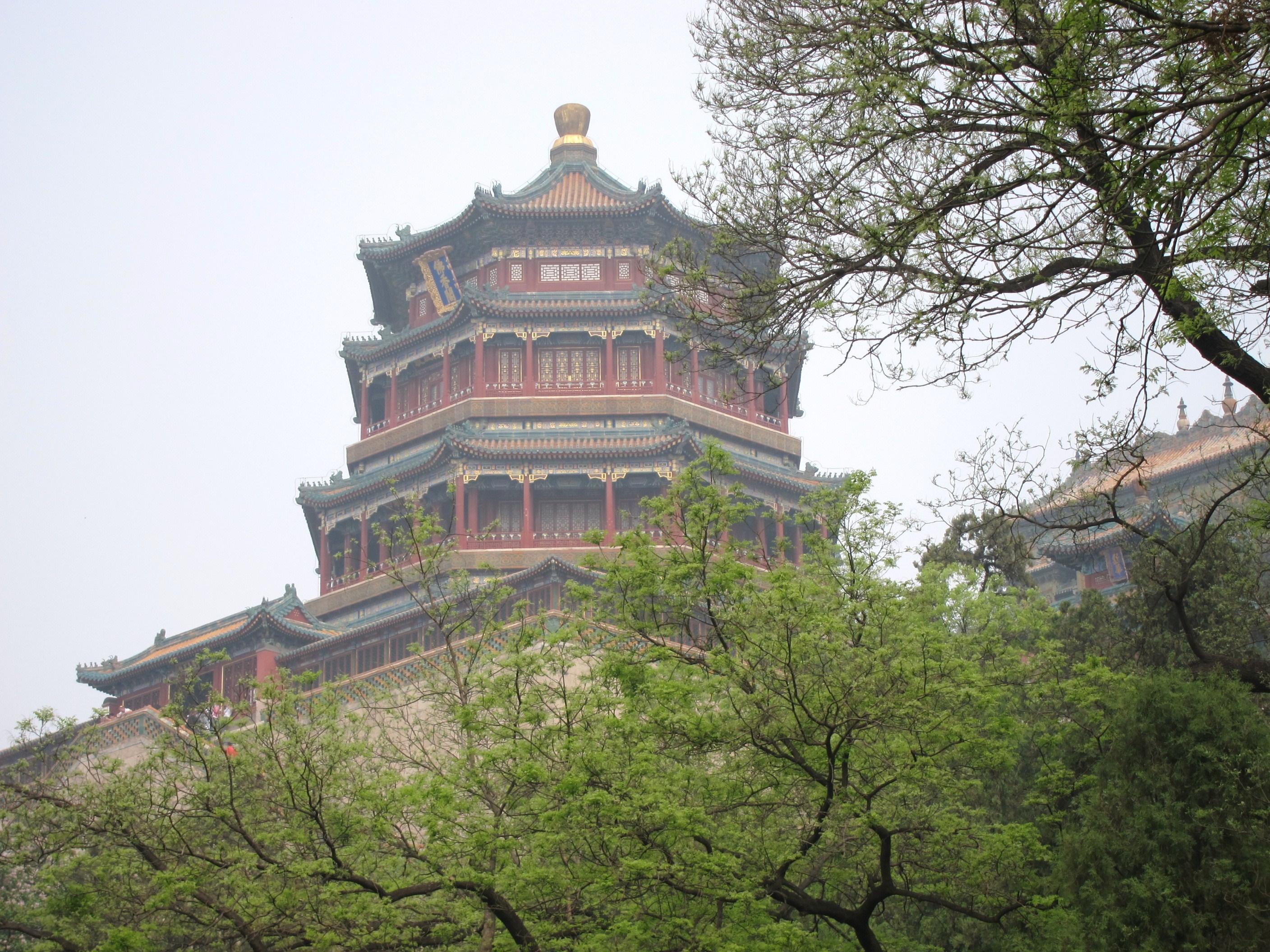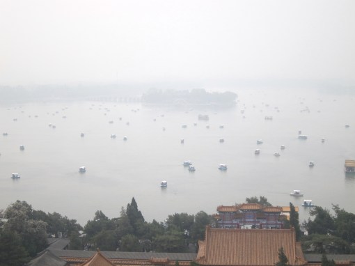 We woke up as stiff as before, but still game for what lay ahead. Sandy and her driver were right on time and we headed out to the northeast of the city to see the place where the emperor moved his court during the summer months. Although only a few kilometers from the Forbidden City, the Summer Place was as green and pleasant as the Forbidden City had been barren and dirty. Trees and flowers lined the walkways, and the grounds were boarded by a pleasant lake on which there were scattered hundred of little paddle boats. We strolled through a colonnade whose beams were painted with scenes of pastoral China, and climbed to the top of the Buddhist temple, twice razed by colonial powers in their attempt to humiliate the emperor and gain trade access to China’s vast market. Rebuilt in 1902, the temple affords a lovely view of the lake, its vista tempered by the ever present smog which hangs over this country like a veil.