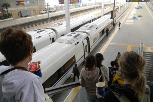 Tianjin airport was clean and efficient and we easily found the ticket booth for the train to Beijing. The bus at 40 yuan was cheaper, but the train at 60 yuan ($10) is a better option. There was a connecting bus, which was not pleasant, but not terrible. The train however, was marvelous. We hummed along at nearly 300 kilometers an hour and the ride was a smooth as your grandma’s rocking chair. Outside the rice paddies and vegetable plots eased peaceably by. There seems to be some kind of reforestation program going on, as there were acres of newly planted poplars everywhere along the train tracks.