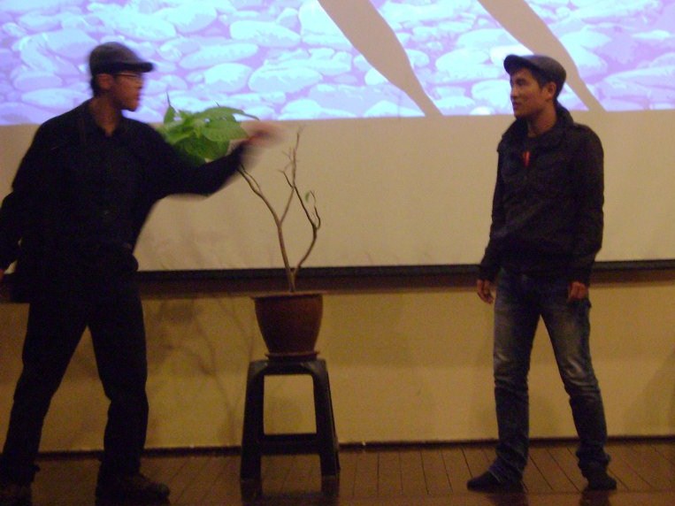 Last night we staged our productions in the largest lecture theatre on the main campus, one that has a proper stage and tiered seating. Despite several weeks of advertising, promoting, and rehearsals, I confess I was disappointed with the audience turnout. The theatre was considerably less than half full despite my best efforts. However, that does not detract from the performances, which were enthusiastic, well-memorized, and well-executed. I sat in the wings ready to prompt, but frankly had little work to do all night and instead was able to see some really fine performances by students who clearly enjoyed the experience. It is a great joy to me as a teacher to see my students take on a class project like this. They got to feel like they had taken part in something larger than themselves and contributed to its success.