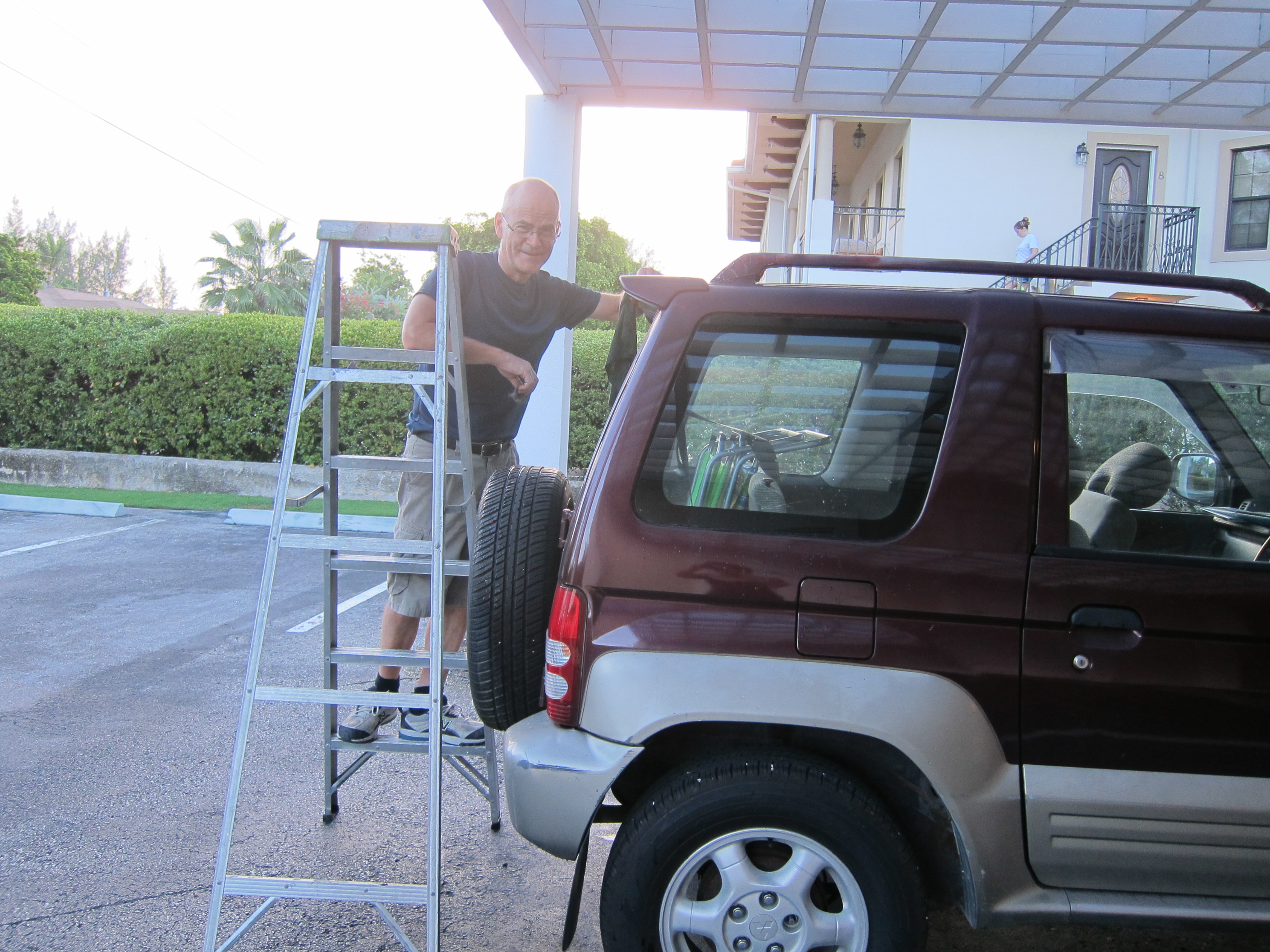 So armed with little more than a couple of cans of spray paint and some steel wool I took on the job of repainting the hood and roof, the two worst offenders. Dodging tropical storms and mosquitoes on the one hand, and my own bone dead fatigue at the end of a work day on the other, I have persevered until the car looks at least half-decent. I thought to cut myself some slack by replacing the rusted out windshield wipers arms with new, but at $150 Canadian – each! – I decided to do them myself as well. I am done, and at the end we still have a beat-up island car that is twenty years old. But it does look a little less embarrassing.
