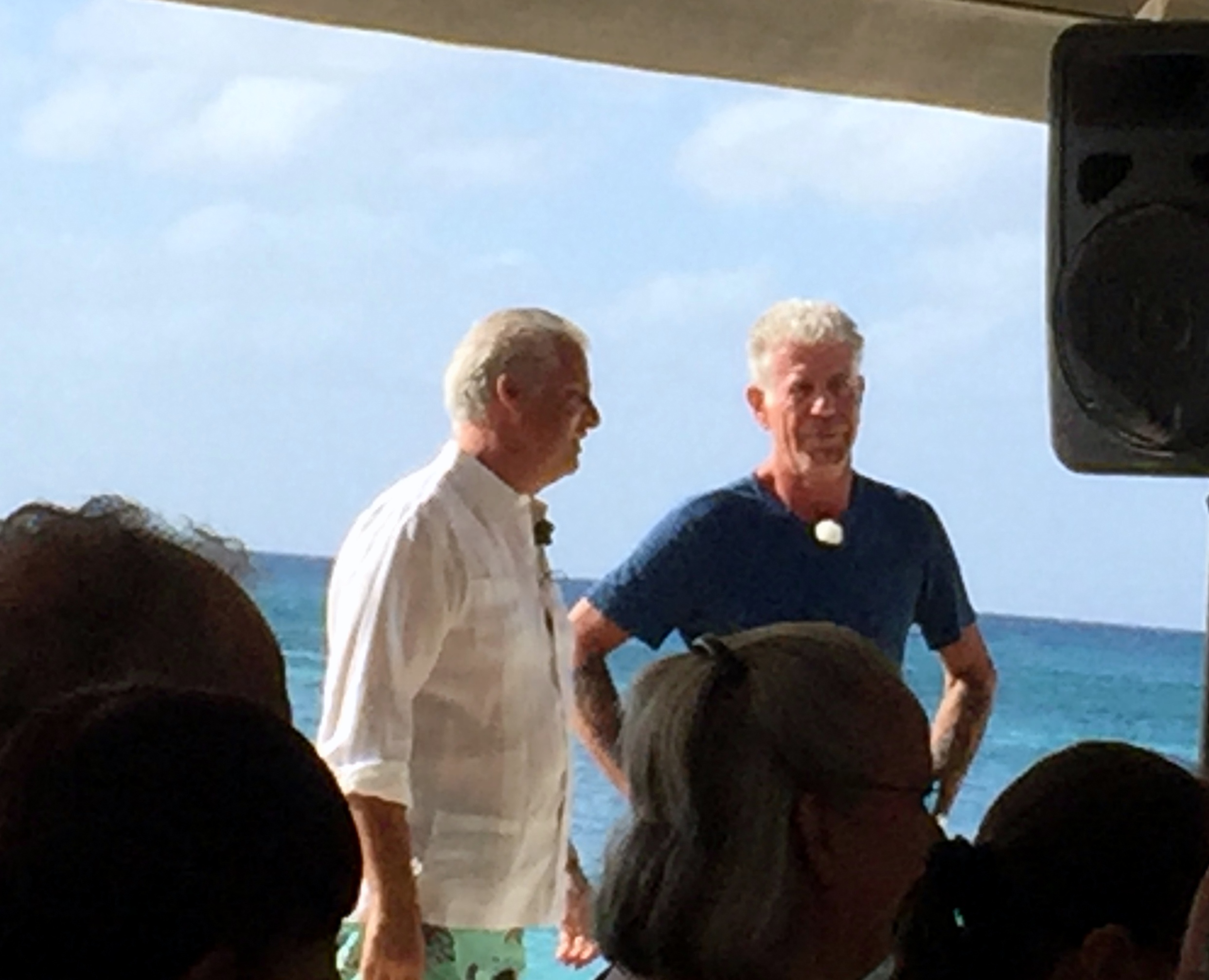 ON the beach there was a tent set up for the event. Having never watched Parts Unknown, Bourdain’s TV show on CNN, we were not sure what to expect. We love exotic food, but are not what you would call food fanatics, and I think the last cooking show we saw was the Galloping Gourmet! We were unexpectedly delighted. The two were quite clearly in their element together, as Anthony whipped up a fettucine carbonara while they bantered back and forth about technique. A sample: Eric, “Take it easy with that. You should make love to the food, not beat it like that.” Anthony, “I don’t like the sound of that. You keep your hips away from this counter, if you don’t mind.”