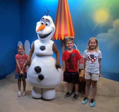 The kids are at great ages for the parks with the ability and knowledge to appreciate the venues and rides and the stamina to keep on going for the entire fourteen hours we spent at the Magic Kingdom. Eli is tall enough for most rides and is fearless; never to be out-done by her brother and sister. Tower of Terror (which we did twice) and Space Mountain are joy rides for these guys. We all loved Soarin’, the 3D videos and the gentle rides through the woods of Snow White and the oceans of the Little Mermaid. You can never go wrong with a Frozen sing-along and a chance to do what snowmen do in summer.