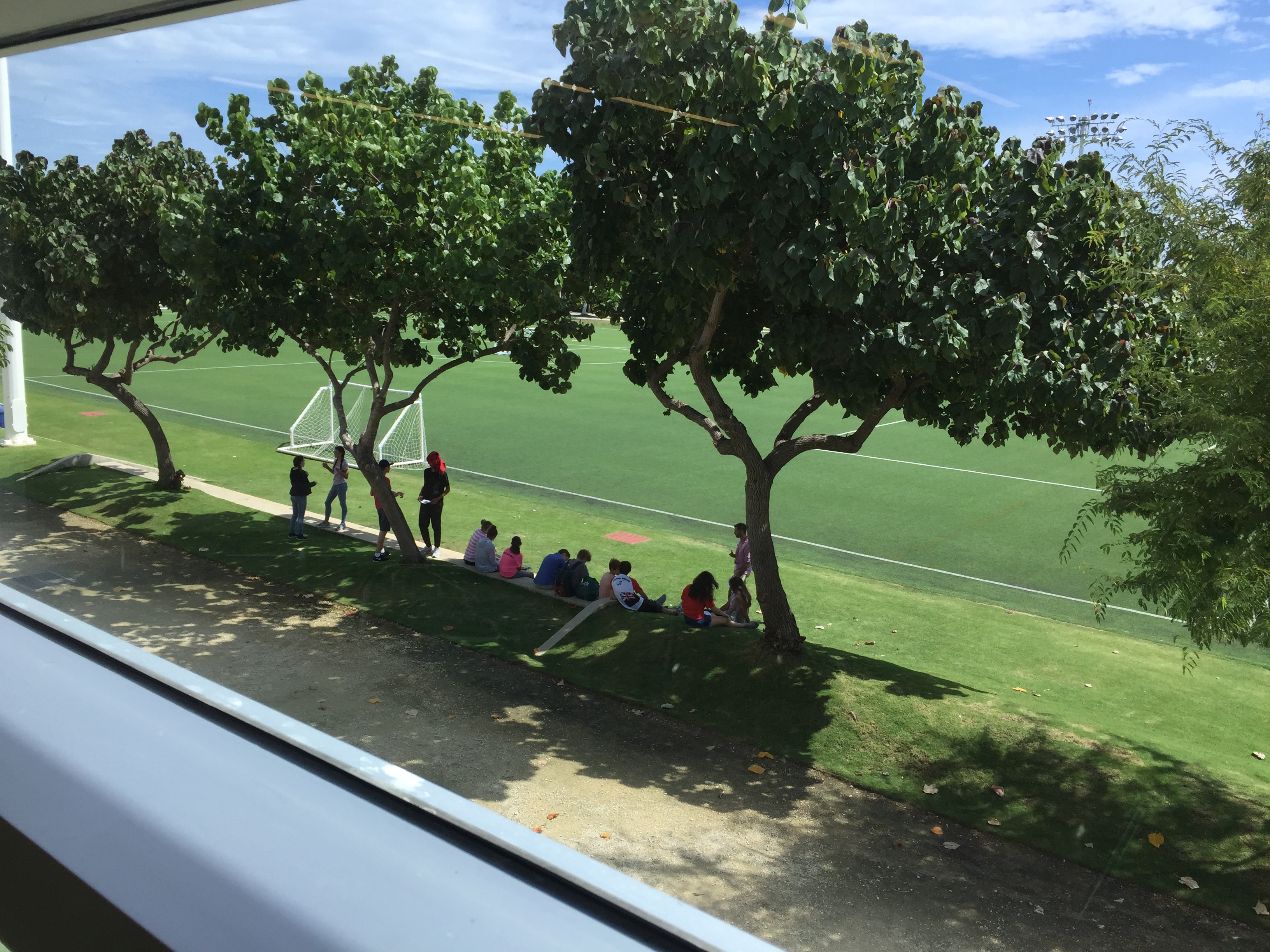 I have a very nice classroom that is well equipped with shelves and cupboards. I have my own little coffee bar set up, and a sink to clean the desks. I have a nice large desk myself with a decent computer, fast internet and easy access to my files through a central server. I have a state of the art SmartBoard which I use constantly, and down the hall a tech lab to help with the video recording I have to do for IB. Just further down the hall is a well-stocked library for the novels and plays that I must teach. I have a view of the soccer field from my desk, and a courtyard outside my door where I can listen to the parrots and mockingbirds in the trees. And finally! after near freezing to death in Malaysian classrooms, full control over the aircon in my own room, which I keep at a comfortable 25.