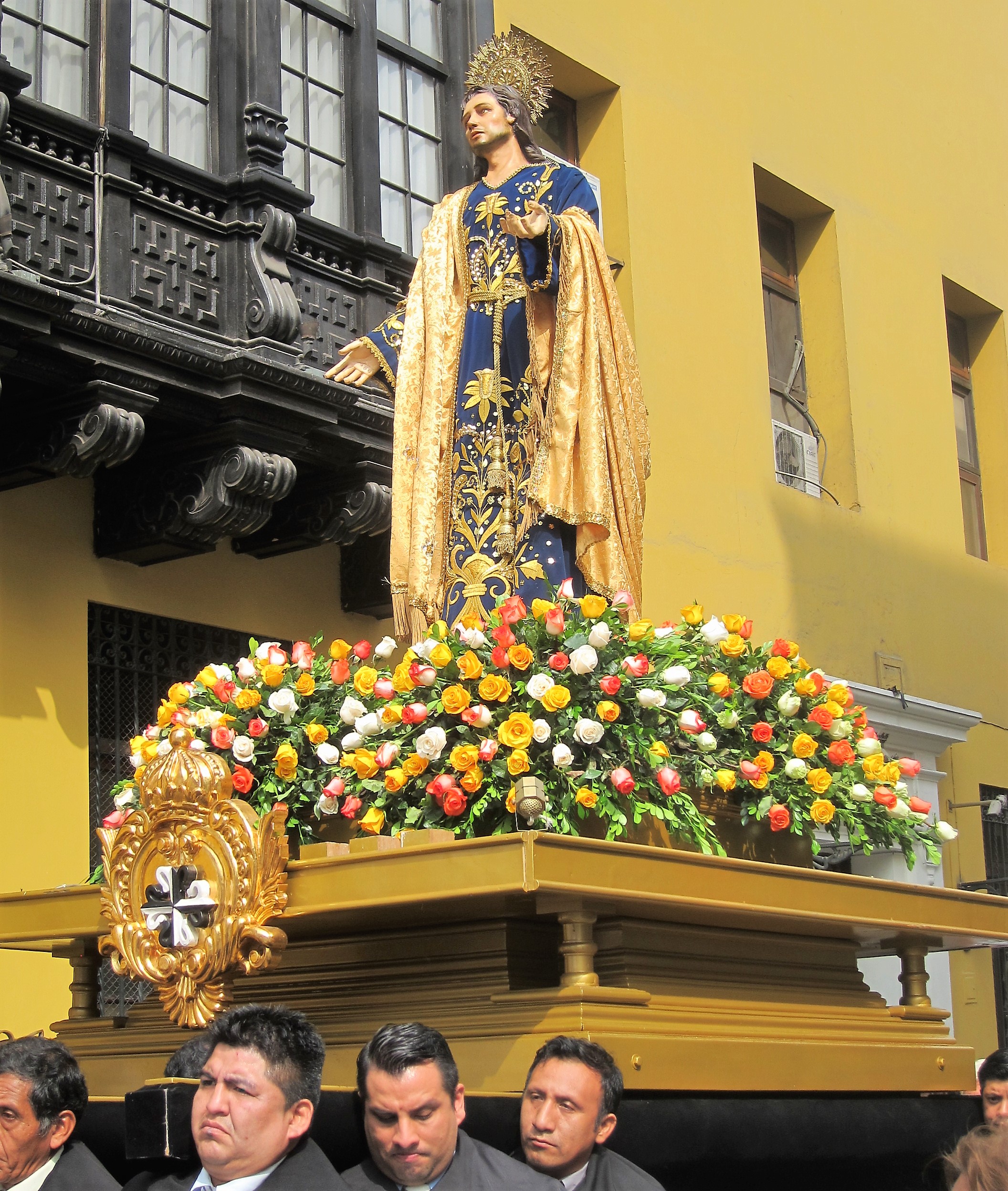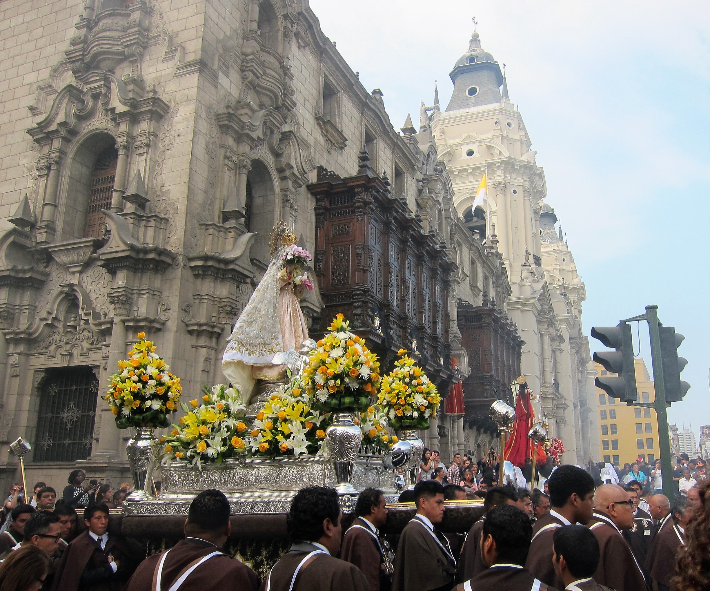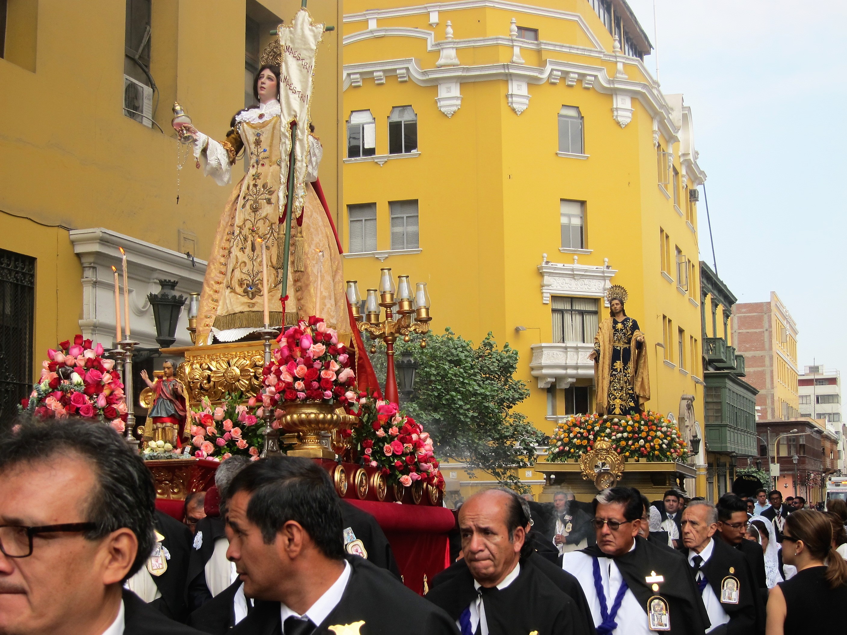 We followed the sounds of music to a side street in time to witness the arrival of two processionals coming from opposite directions, to converge at the 16th century Cathedral in the heart of old Lima Centro. Each group carried four figures of about ten feet in height, balanced on a platform on the shoulders of 14 to 16 men. They were each accompanied by a marching band, incense burners and columns of worships and came to a halt every few minutes to allow the men to rest.