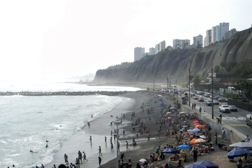 Having checked out Lima on Google, we thought it best to stay on the southern edge in a district called Miraflores. Again, no mistake there, for as we drove along the Pacific boulevard the hang gliders were sailing down over the cliff and the surfers were braving the gravelly beach by the score. We checked into the Radisson, where we got an upgrade to a superior room that overlooked the ocean and after a quick change of clothes and a brief look at Google maps, wandered out into the late Peruvian afternoon to J.F. Kennedy Park.