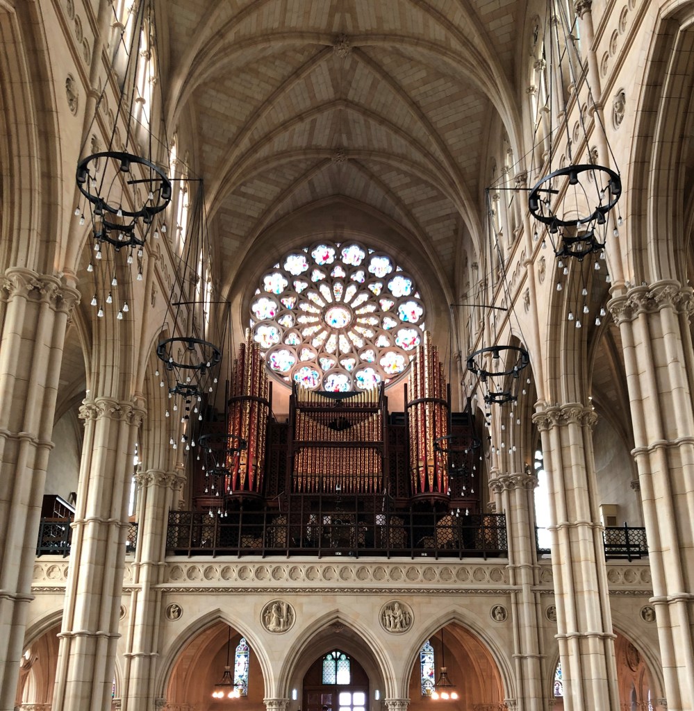 Sitting at the top of the hill overlooking the town is the impressive Arundel Cathedral. It was commissioned by the Duke of Norfolk in 1868 and its designer was Joseph Hansom, the most notable architect of the Victorian Age (whose name survives as the designer of the Hansom Cab). Built in the French Gothic style, it features a spectacular round stained glass window reminiscent of Notre Dame in Paris and a huge vaulted nave.