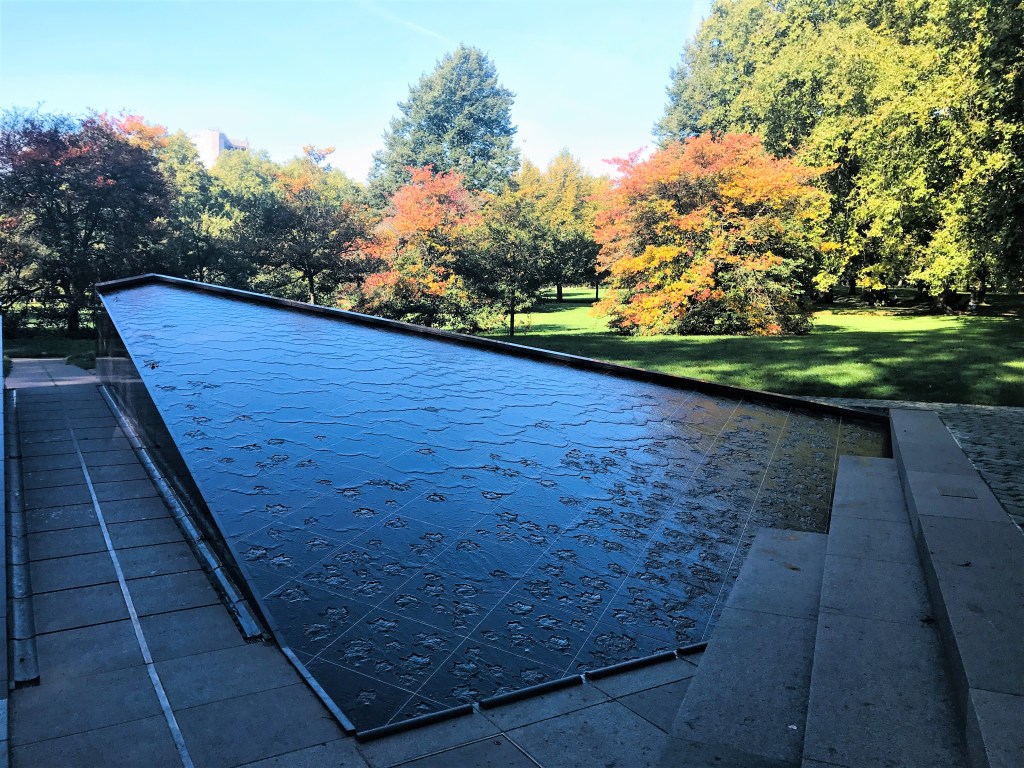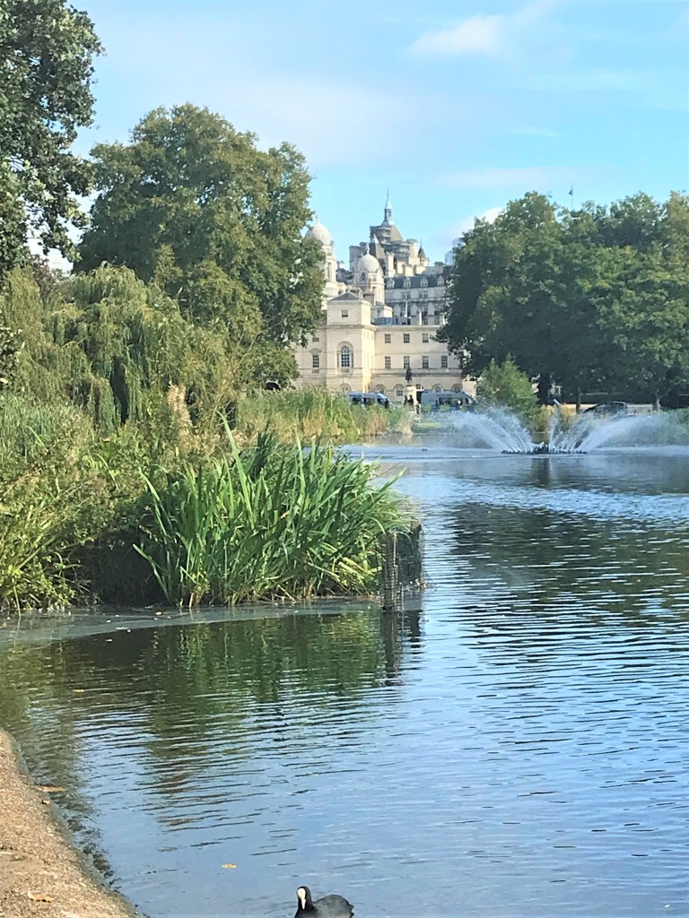 We dropped by Buckingham Palace but the the Queen was not in to greet us. However we did catch the end of the changing of the guard before wandering into Green Park where we saw the Canada Memorial, a lovely sculpture in which shimmering water flows over the monument giving the impression of maple leaves gradually changing in colour from dark brown to bright green. Maple trees planted by the monument were in full, glorious colour, giving us a lovely taste of the fall season that we have missed so much.