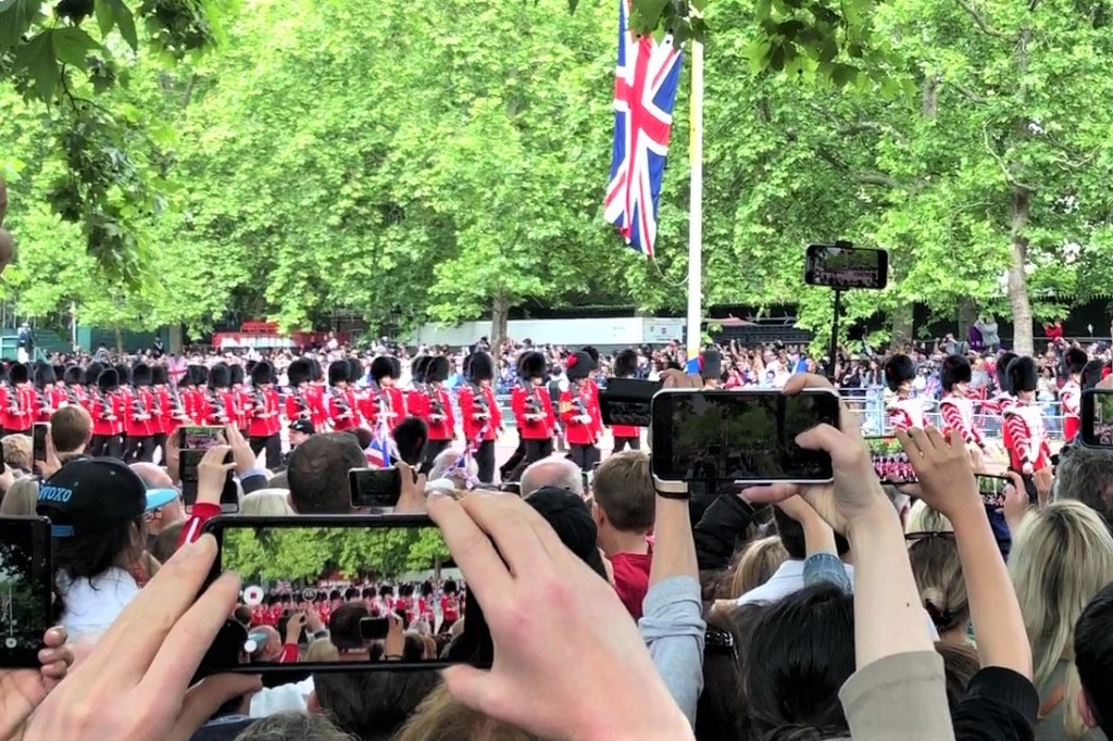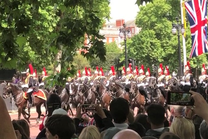 I had brought my selfie stick and by holding up my phone as far as my arms could reach was able to capture some shots of the various horse guards and mounted military bands that paraded by. Everyone was good spirits and there was no shoving or shouting to be heard, except for the raucous applause when the troops went parading by. We caught a glimpse of what might have been a few royals, but we make no claim to have seen anyone notable.
