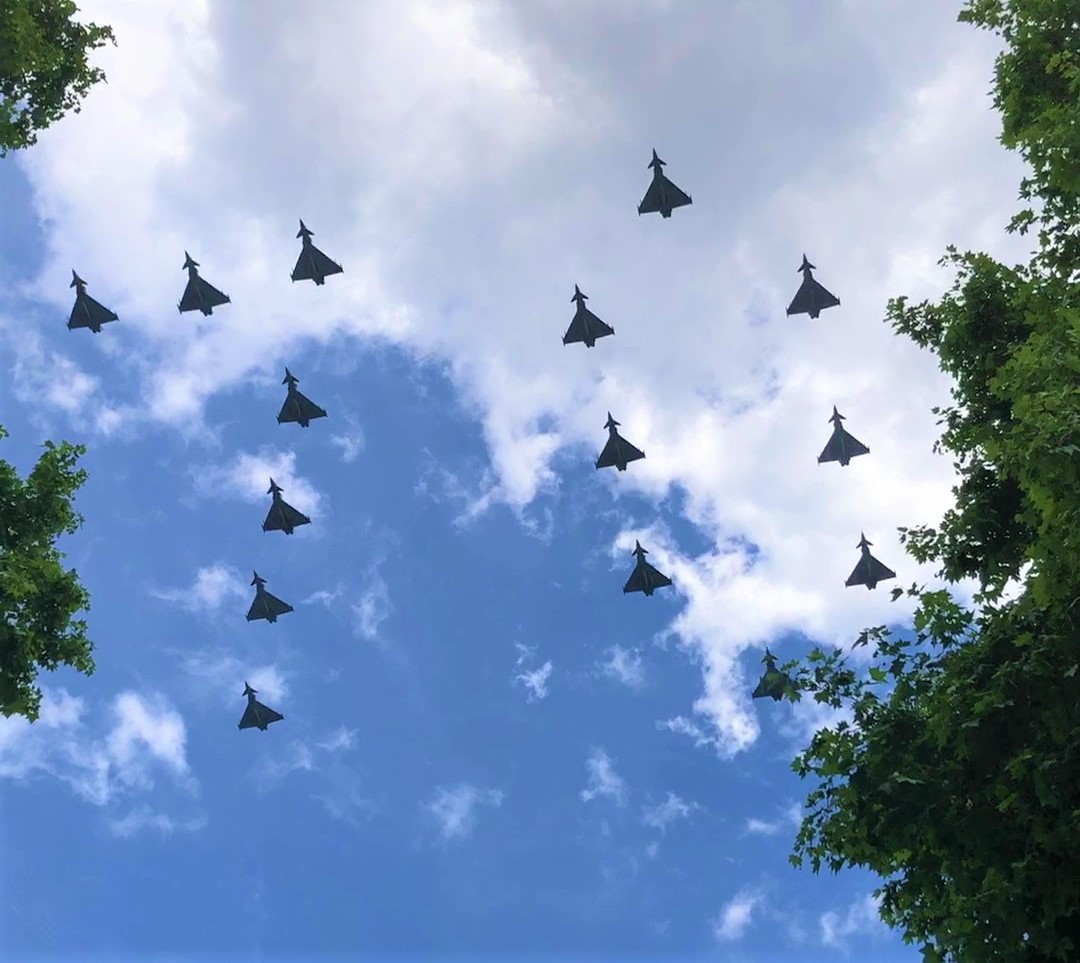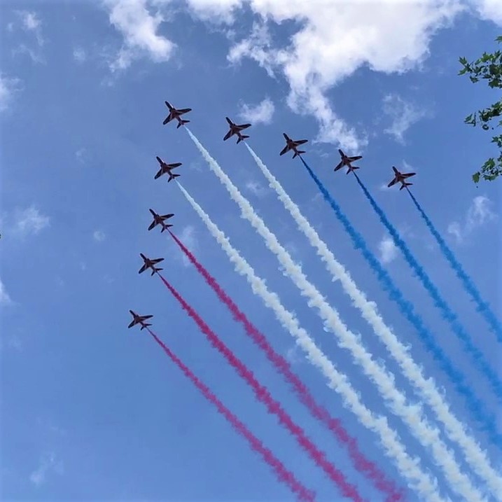 After the troops had paraded both up and down the Mall, the crowds were allowed to leave the barricades and move forward to surround the Victoria Monument in front of Buckingham Palace. We opted instead to find a place in Green Park where we could see the flyby of the Royal Airforce in formation going over the skies.